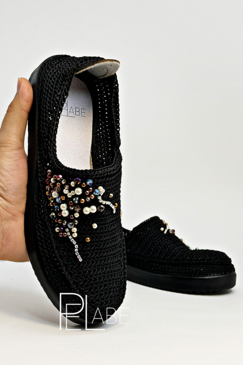 یک جفت کفش دستدوز و سنتی که با نخ های زیبا تزِیین شده .